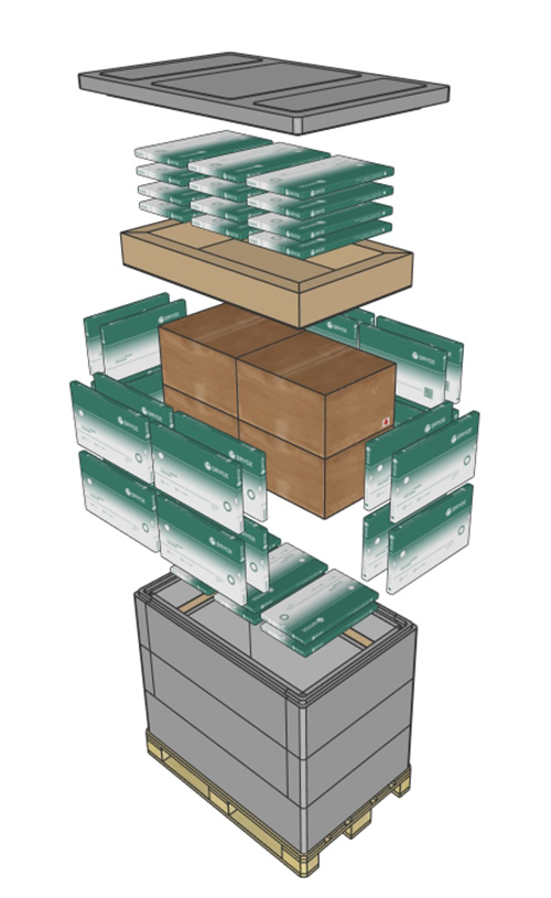 Large-format pallet packaging, pre-qualified for long transits.